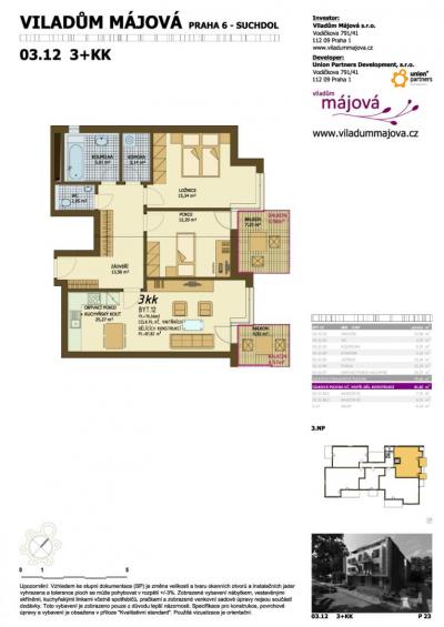 Nabízíme k prodeji prostorný, světlý byt 3+kk o výměře 77m2, s dvěma balkony (7m2 a 5m2), se sklepem 4m2 a garážovým stáním. Novostavba Viladům Májová v sobě spojuje moderní bydlení uprostřed vilové čtvrti v městské části Praha 6 - Suchdol a dobrou dopravní dostupnost metropole. Pokud máte rodinu a děti, hledáte nový byt na klidném místě, ale zároveň chcete zůstat v dosahu centra Prahy, je právě byt v tomto projektu určen pro Vás. Kvalitatovní standard bytu odpovídá vyjímečnosti projektu a zahrnuje dřevěná okna, dlažby Rako, vysokotlakou plovoucí podlahu Parador, zařizovací předměty Laufen, baterie Grohe, vstupní dveře Next, interiérové dýhované ořechové dveře Sapeli, datové rozvody internetu, domácí videotelefon aj. Výtah umožnuje pohodlnou přepravu i s kočárkem. U domu soukromé dětské hřiště. Z hlediska energetické náročnosti se dům řadí do kategorie B.